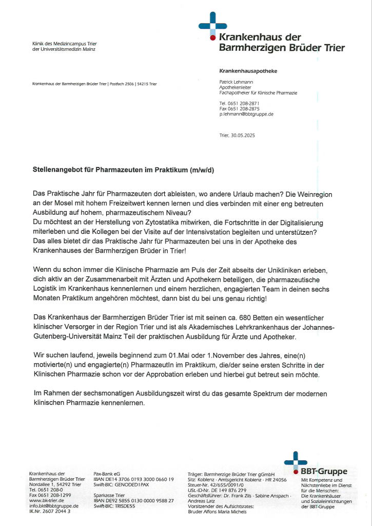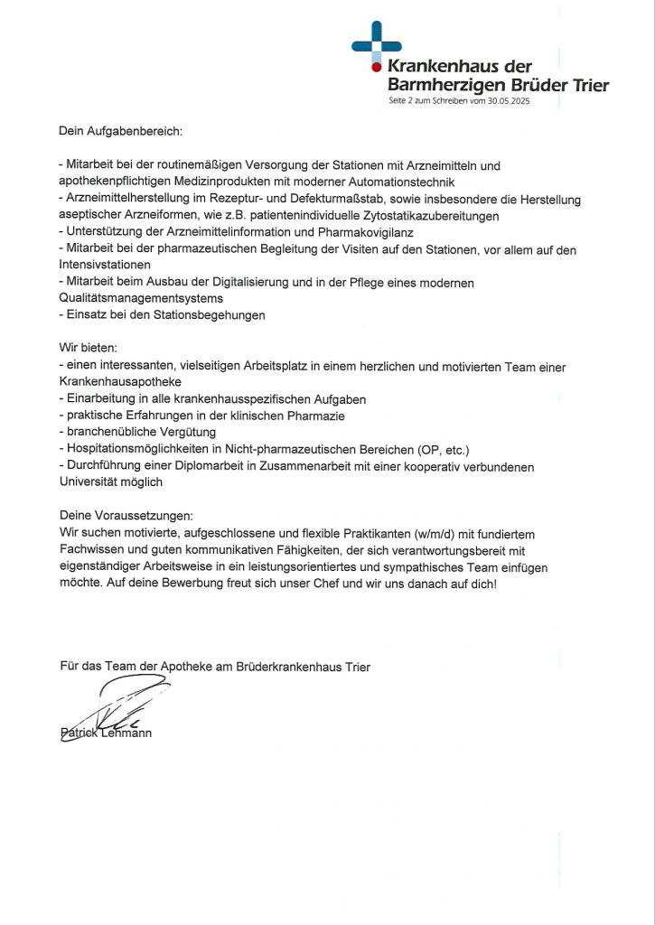 Sie haben zum Zeitpunkt des Praktikums das Studium der Pharmazie mit dem 2. Staatsexamen erfolgreich abgeschlossen.